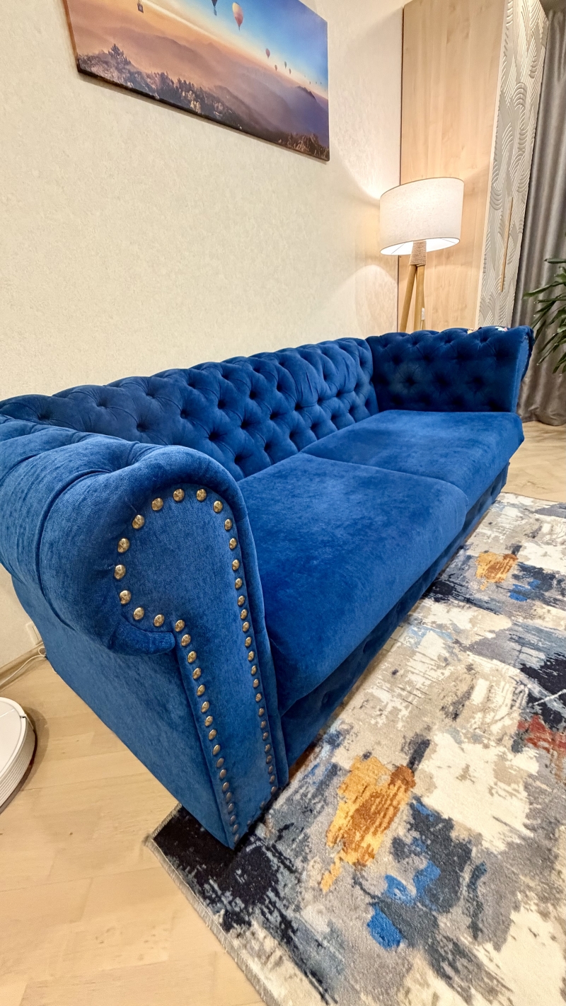 Продаю стильный диван в насыщенном синем цвете. Ткань — мягкий и приятный на ощупь велюр, выглядит дорого и ухоженно. Каркас прочный, спинка и подлокотники с красивой каретной стяжкой, украшены декоративными гвоздиками.